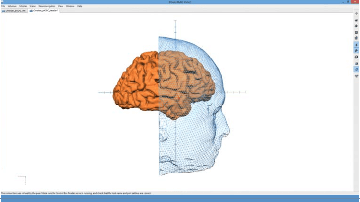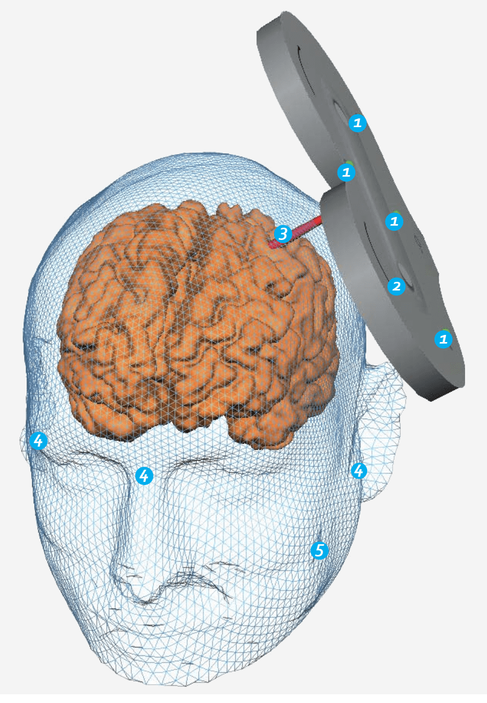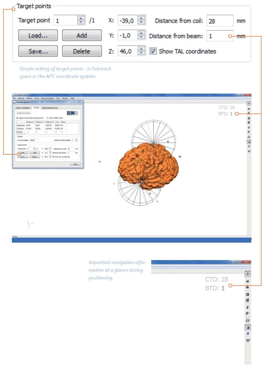 A pointer is required for the co-registration of head and coil. This pointer is a special form of marker with which the reference points on the coil and the head can be sampled in order to define their exact positions. A highest degree of precision in the trackers, pointers and markers is a prerequisite for precise navigation results.