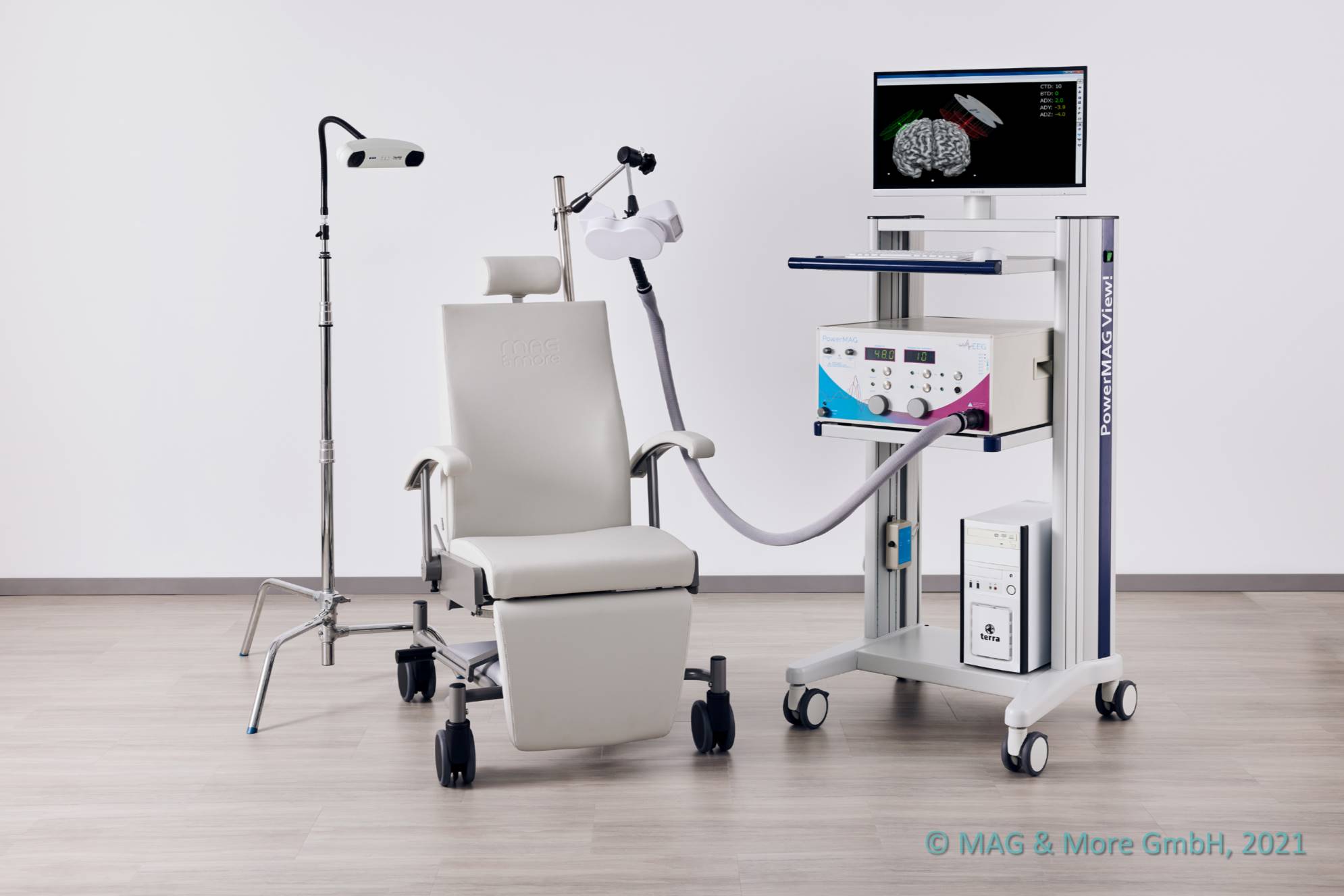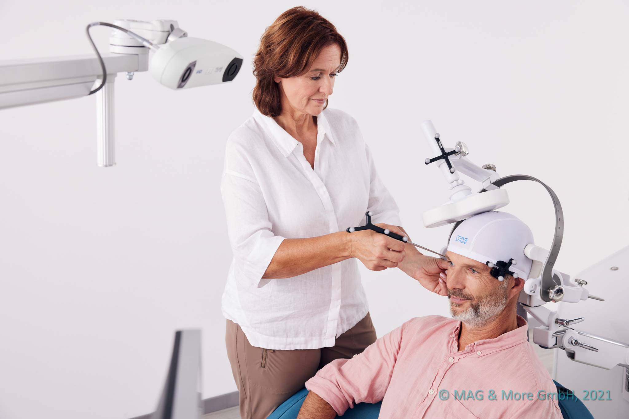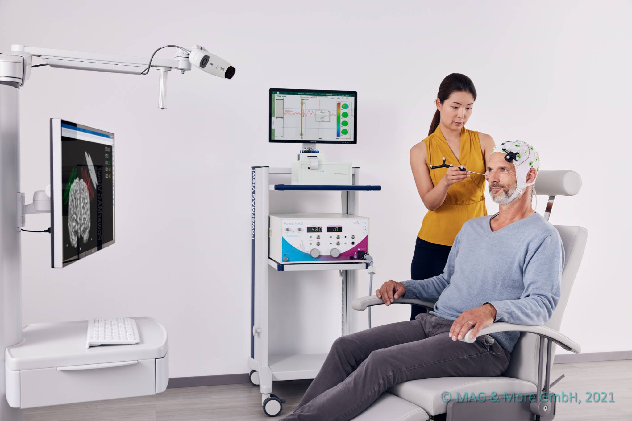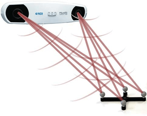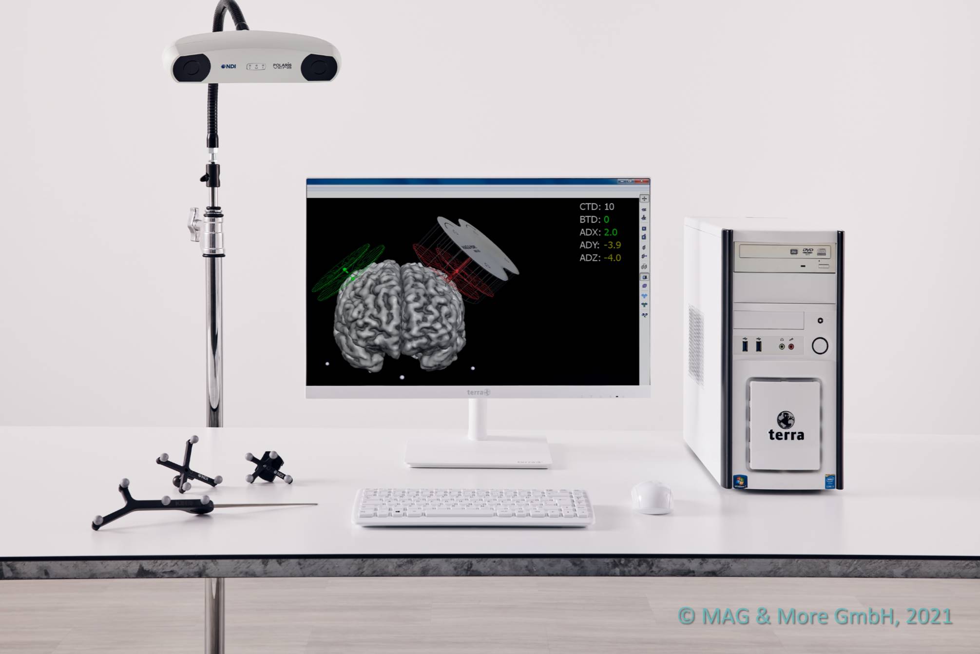 The markers mounted on the trackers reflect the infrared signal transmitted by the camera. This signal is again received by the camera and from this the system calculates the exact positions in space. This technology has the advantage that the tracker is fully free to move as a result of the wireless design. Furthermore, trackers and markers have no electronic parts that could be impaired by the TMS itself.