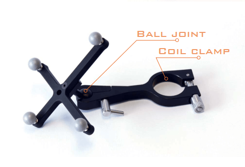 MAG&More offers suitable fastenings which enable a simple attachment of the tracker to the coil or the head cap. The ball joint of the coil fastening enables optimum alignment of the tracker to the camera. A second tracker fastening is also included which can easily be clipped onto a head cap.