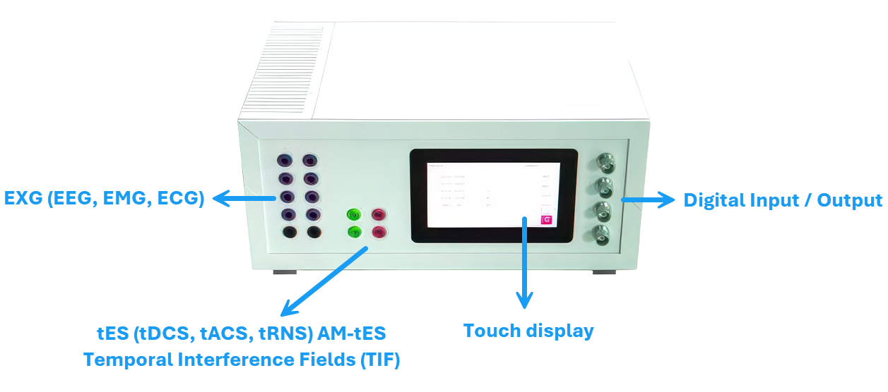 This hardware platform is perfect for realtime data acquisition, analysis, and the control of neuro-modulatory stimulation. It enables state-dependent and closed-loop controlled experiments, Temporal Interferance stimulation and neuromuscular stimulation - all simultaneously and synchronously and within one box.