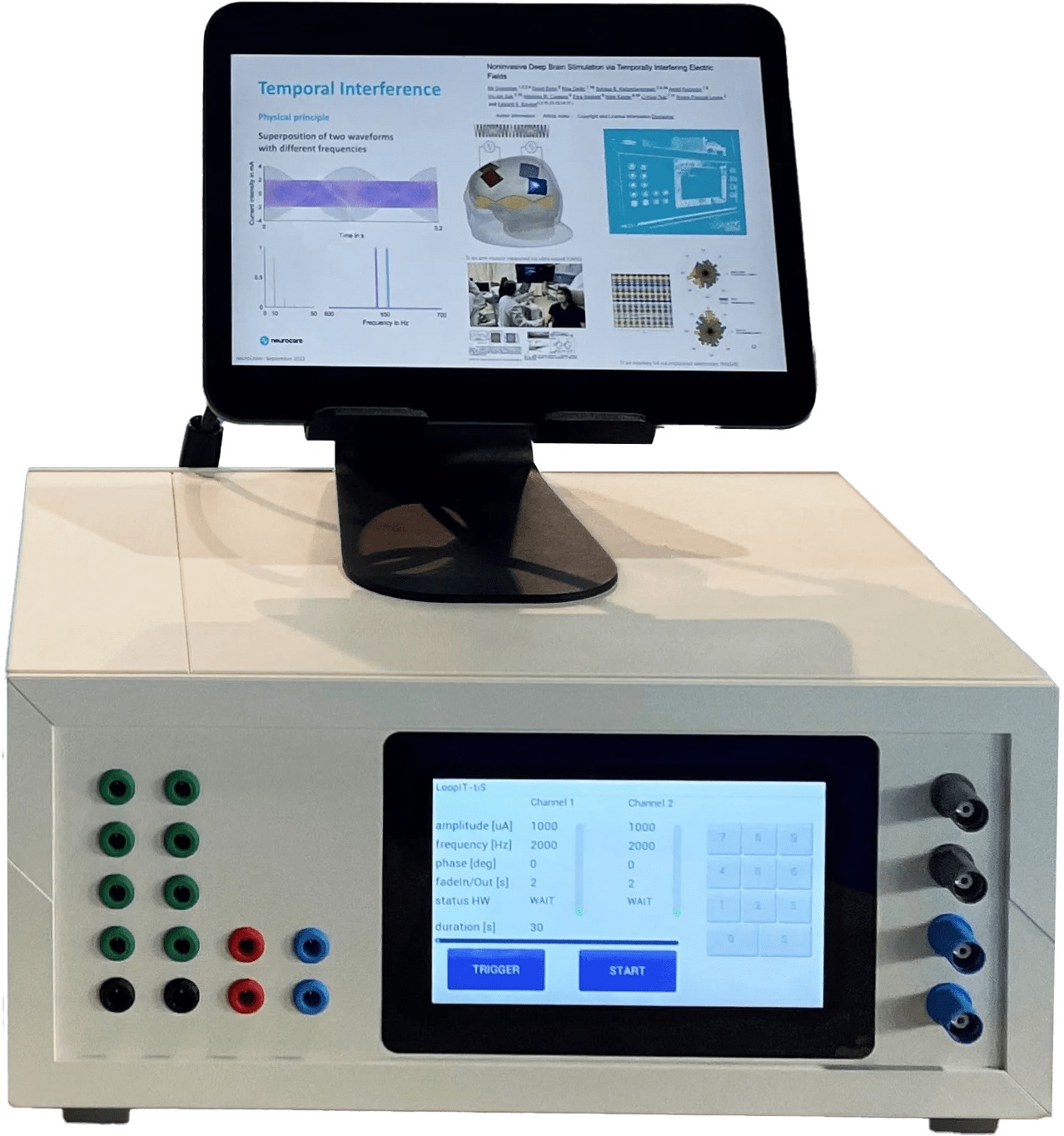 Functioning as a multi-channel stimulator for 2 or 4 transcranial and/or peripheral stimulations, our current sources exhibit low noise, high temporal precision, and galvanic isolation. This setup is specifically designed for temporal interference stimulation as well as pairing transcranial and neuromuscular stimulation, providing a comprehensive solution for advanced neuroscience research.