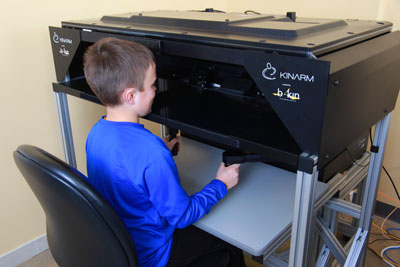 Kinarm Exoskeleton Lab employs a complex linkage to enable horizontal arm movements in the plane of flexion and extension at the shoulder and elbow joints. Torque motors record the arm's motion in the horizontal plane and independently apply loads to each joint. The design provides control and feedback from the shoulder and elbow joints, allowing loads to be applied to the shoulder and/or elbow joints. Patterns of joint motion are recorded, and the system computes muscular torques. The hand is allowed to interact with environmental objects.